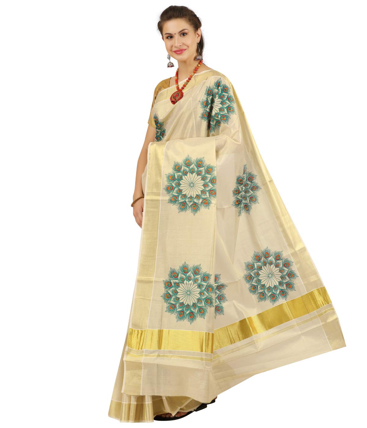 Kerala Kasavu Saree In Tissue Silk Online - Jisb women's kasavu cotton saree with running blouse (jis saree f59_cream).